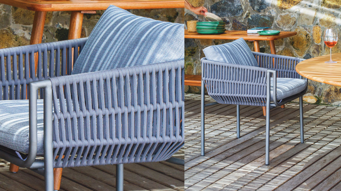 Felicita Acabamento: estrutura em alumínio e tricô 10mm, com almofadas soltas.L: 0,61m P: 0,61m A: 0,72m Data: 2025 Categoria: Cadeira Tags: Cadeiras