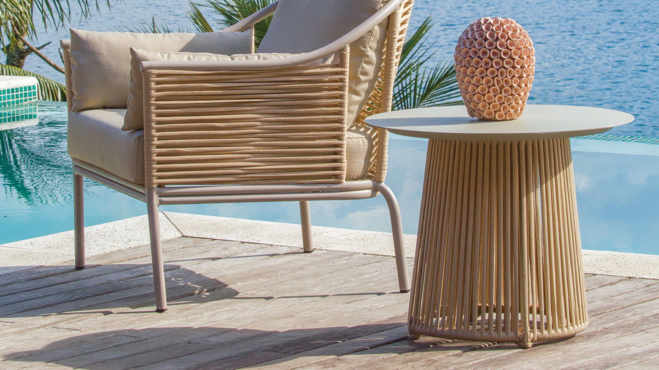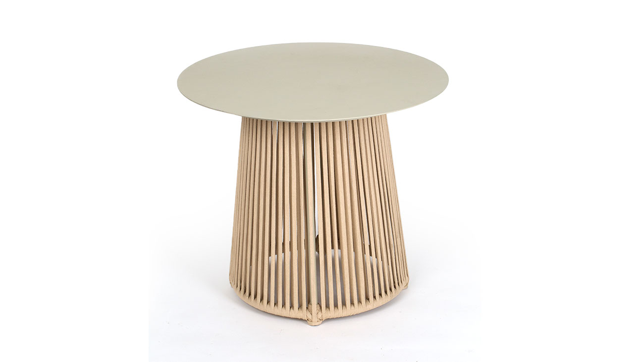 Isla Acabamento: estrutura em alumínio e tricô 10mm com tampo em alumínio.L: 0,60 A: 0,55m Data: 2025 Categoria: Mesa Lateral Tags: Mesas Laterais