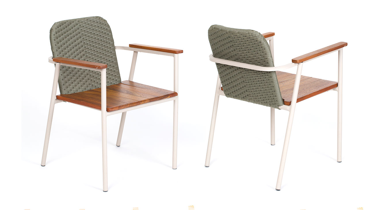 Mirth Acabamento: estrutura em alumínio e tricô 10mm, assento e braços em madeira.L: 0,59m P: 0,63m A: 0,82m Data: 2025 Categoria: Cadeira Tags: Cadeiras