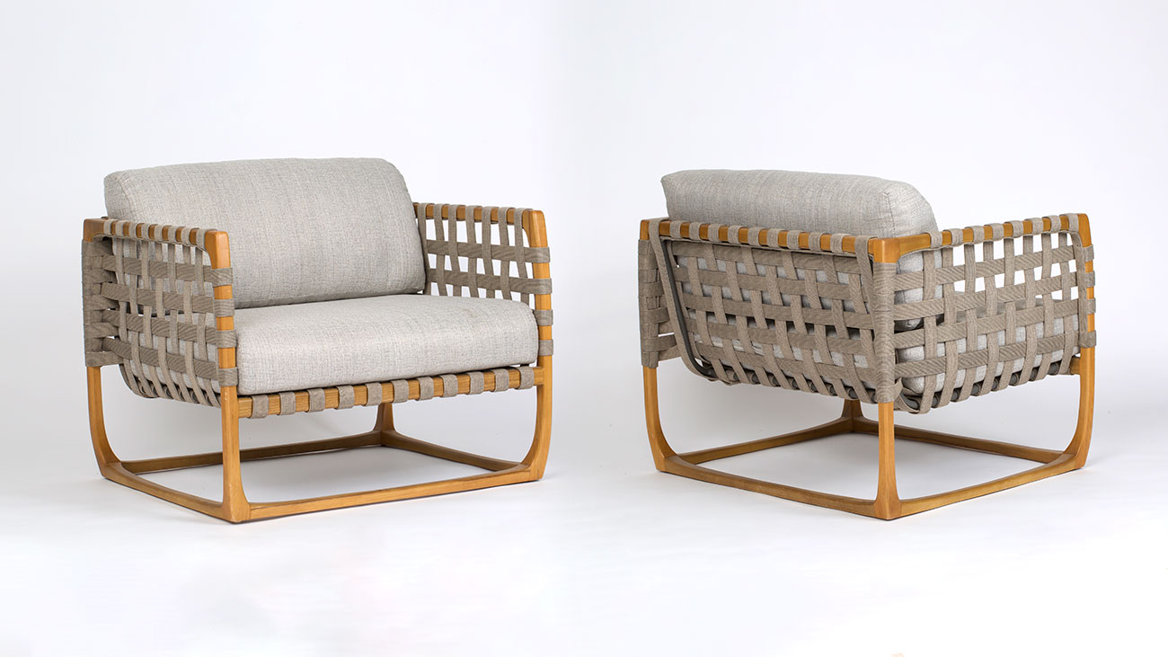 Acabamento: estrutura em madeira, encosto em alumínio e fita tricotada 40mm, almofadas soltas.