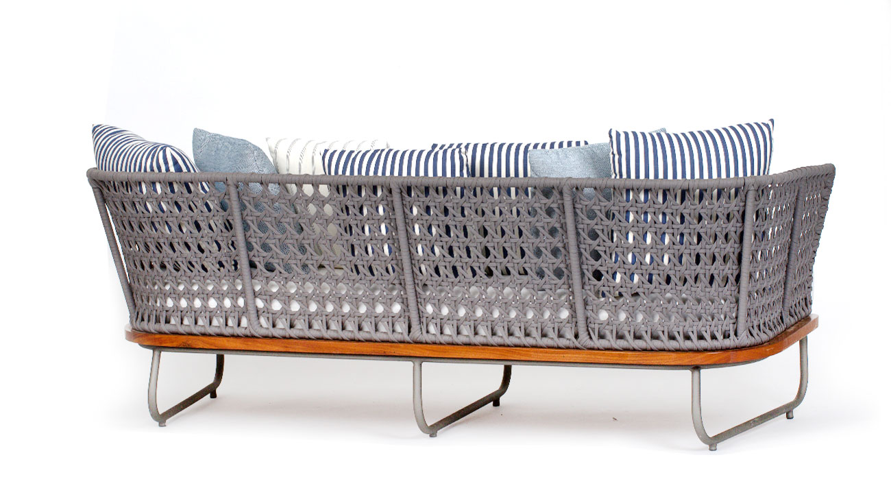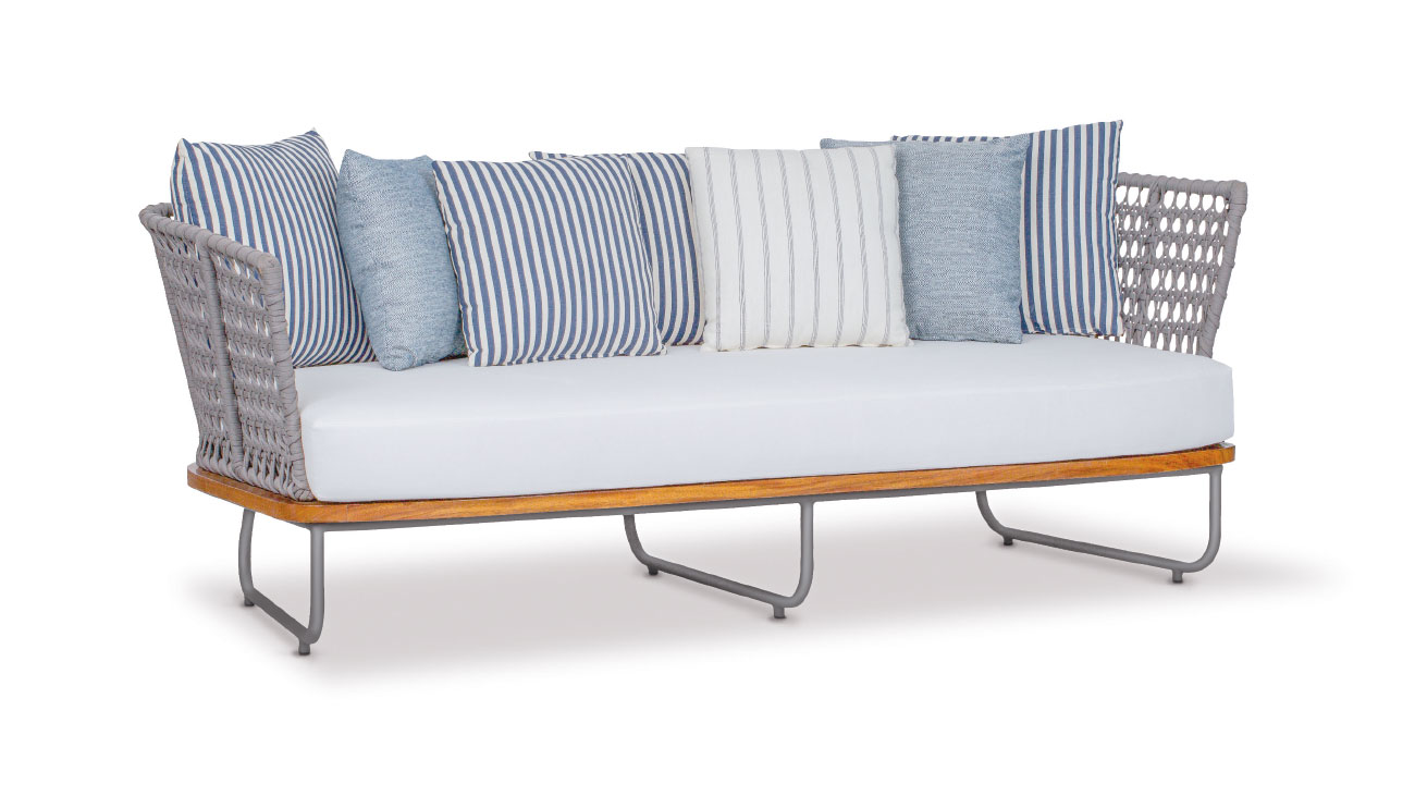 Kiev Acabamento: estrutura em alumínio e tricô 22mm, com assento em madeira, almofadas de assento e encosto soltas.C: 2,20 P: 1,02m A: 0,79m Data: 2025 Categoria: Sofá Tags: Sofás