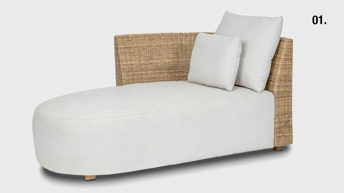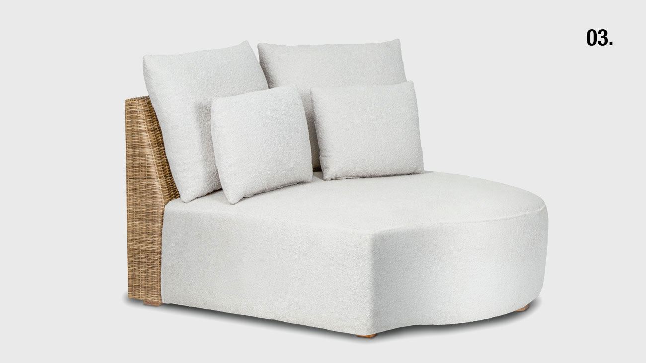 Módulo Bianco 01. Módulo Bianco ChaiseAcabamento: estrutura em madeira e junco, almofada de assento fixo e almofadas de encosto soltas.C: 2,20 P: 0,89m A: 0,87m 02. Módulo Bianco PoltronaAcabamento: estrutura em madeira e junco, almofada de assento fixo e almofadas de encosto soltas.C: 0,72 P: 0,90m A: 0,73m 03. Módulo Bianco CantoAcabamento: estrutura em madeira e junco, almofada de assento fixo e almofadas de encosto soltas.C: 1,10 P: 0,20m A: 0,73m Data: 2025 Categoria: Sofá Tags: Sofás